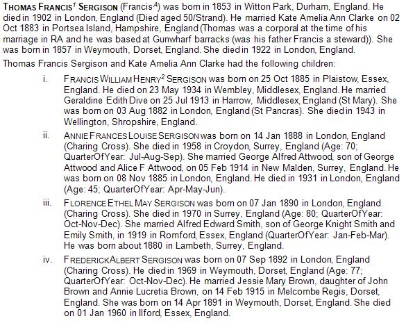 My one name study into the surname Sarginson has revealed a number of soldiers with the surname variant Sergison/Sergesson, many of whom were born either in Ireland or Scotland. During my research I have disentangled two individuals: Francis Sergison a Roman Catholic baptised in Barony, Glasgow in 1851 aged 3 and Thomas Francis Sergison, probably Church of England, born apparently in Witton Park, Durham. A summary of what I’ve been able to find out about him so far is included in the following descendant chart: